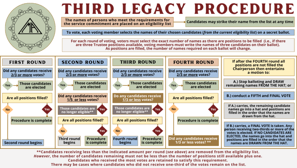 The Third Legacy Procedure can be a complex process. By clicking the + symbols below, you can see the procedure and voting process in full written form. We hope that you find the visual helpful and we have developed an FAQ listed below. If you have further questions, they can be asked during the Conference training session or by emailing [email protected].