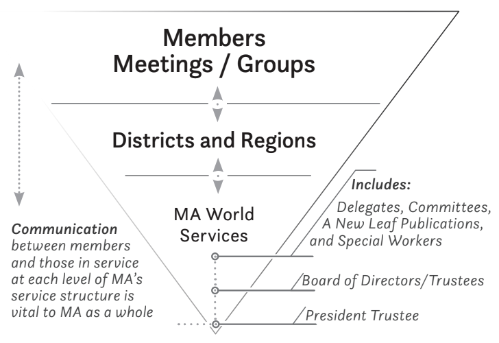 The Service Structure of Marijuana Anonymous is described as an inverted pyramid which includes three levels. Members, Meetings, and Groups make up the broad base at the top of the pyramid. The middle level consists of Districts and Regions. The tip, or the smallest portion of the pyramid at the bottom, represents MA World Services, which includes Delegates, Committees, A New Leaf Publications, Special Workers, and the Board of Directors/Trustees.